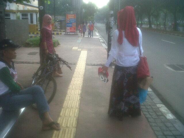 Kami bertiga ngga tau kalau hari itu ada acara car free day sepanjang jalan Sudirman - Thamrin. Sehingga mau tak mau kami harus berhenti dan berjalan kaki dari bunderan Ratu Plaza. Ada insiden "kelom copot" dalam perjalanan kaki ini. Untung orang-orang Jakarta cuek-cuek ya, jadi aku ngga malu jalan "nyeker" sampai ke lantai 6 Gedung F Kemendiknas (*cuma ada satu bapak aja yang ngeliatin, hihihi...).
